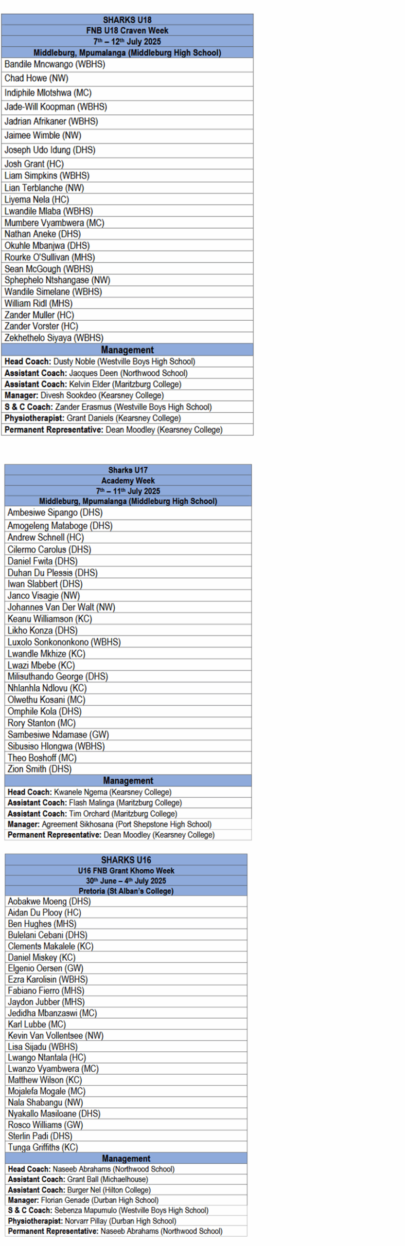 The Sharks u18 Craven Week and other youth week teams are expected to be announced on Wednesday, 21 May 2025.